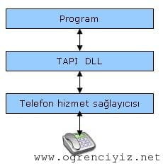 Aşağıdaki şekilde görüldüğü gibi telefon aygıtını kullanmamızı sağlayan üç yazılım katmanı vardır: Bir program, TAPI, bir telefon hizmet sağlayıcısı ve bir aygıt (telefon, fax/modem vb).